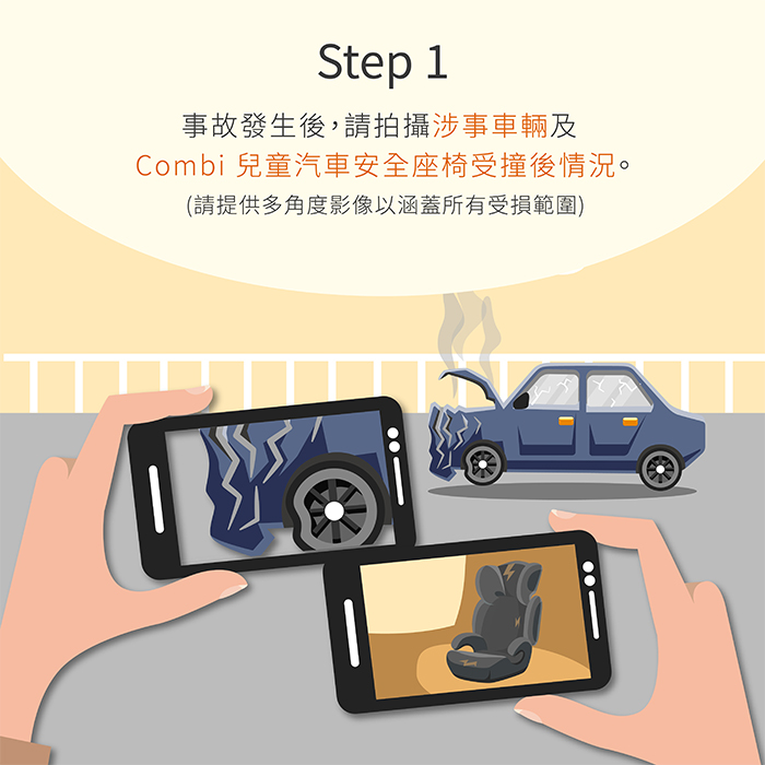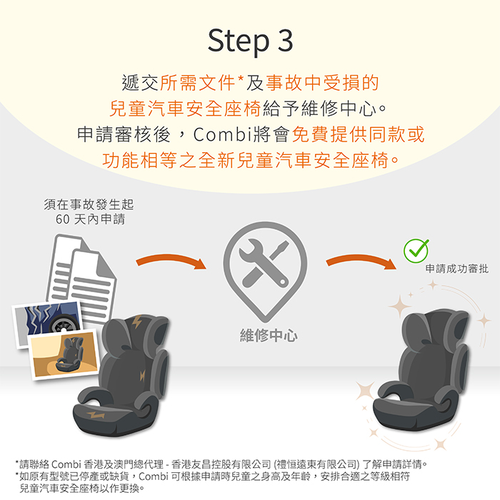 在此情況下,顧客可優先透過個人汽車保險處理相關賠償。如保險未有涵蓋或索償不成功,只要符合 Combi 指定之申請條件,我們將免費提供同款或功能相等之全新兒童汽車安全座椅,作為對家長的額外保障與支持。